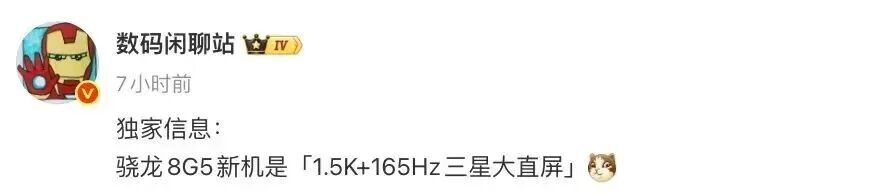 更早之前,这位博主的爆料中还提到过:“骁龙8G5新机是「1.5K+165Hz三星大直屏」”。