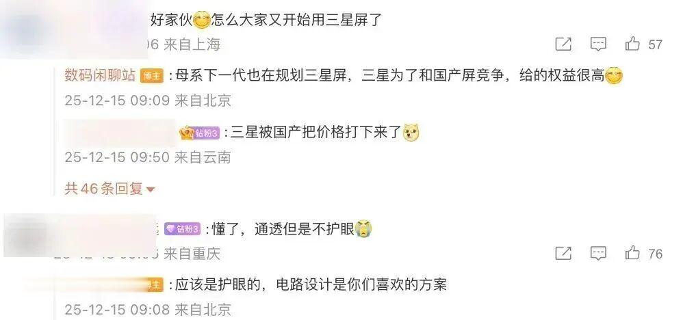 同时,有网友评论“怎么大家又开始用三星屏了”,这位博主的回复显示“母系下一代也在规划三星屏,三星为了和国产屏竞争,给的权益很高”。