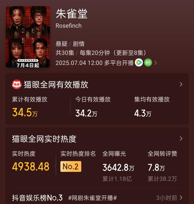 难怪刚播2小时,热度便突破4900,全网累计收视破3600w,成绩惊人。