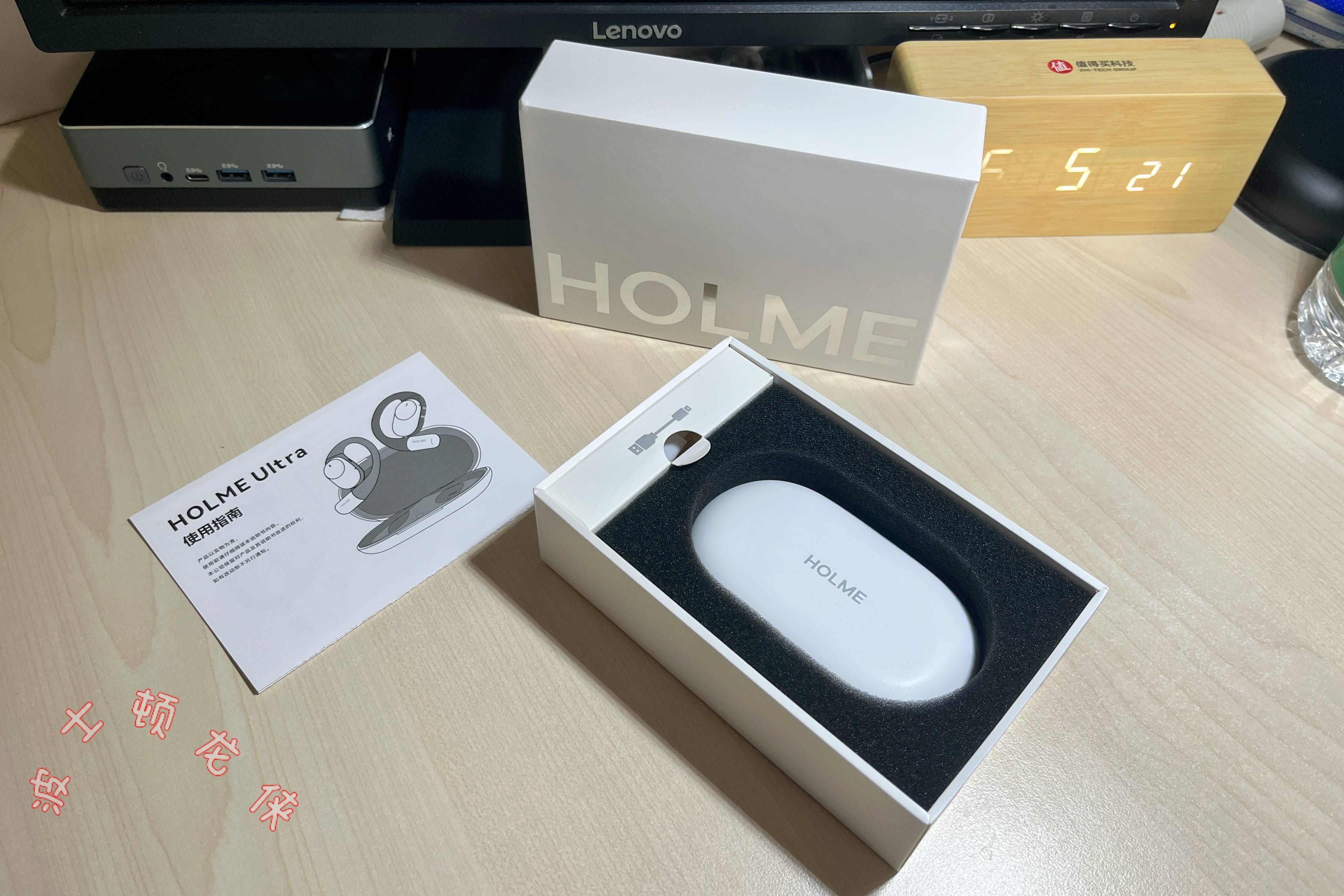▲上开盖打开包装,内部附件为说明书、耳机充电仓(内附耳机一对)和A2C充电短线。Ultra也同样有虹觅白(本品)和虹觅黑两种经典配色。