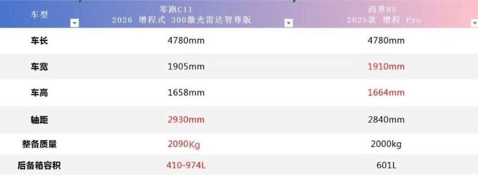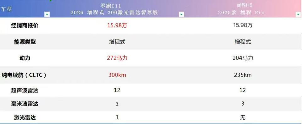 但是,尚界H5到底值不值得买,15-20万价位区间,相比较同样定位中型SUV且热销的零跑C11来说,究竟谁更值得入手?我们从外观、空间、动力续航、配置上进行对比。首先是价格,零跑C11在终端的售价为14.98万-16.58万,同样具有纯电和增程版可供选择。为了公平起见,我们对比的是尚界 2025 增程Pro和零跑C11增程式300激光雷达版,前者是增程的入门版,售价为15.98万,后者是顶配,同样售价15.98万。