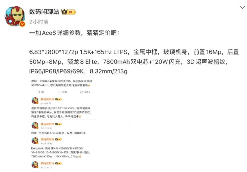 今天,博主@数码闲聊站 的一份爆料中提到了一加Ace 6的详细参数。
