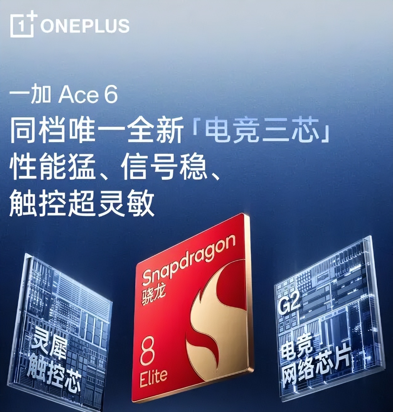一加Ace6还搭载全新冰河散热系统,散热快 2 倍。超临界气凝胶、超薄手撕钢打造的冰河VC、冰河后盖、游戏手模型全部散热黑科技都顶满。还有同档唯一“电竞三芯”,全新风驰游戏内核,释放骁龙 8 至尊版最强性能;全新升级电竞网络芯片 G2,蜂窝、Wi-Fi 全都强;全新升级「灵犀触控芯片」,触显同步。