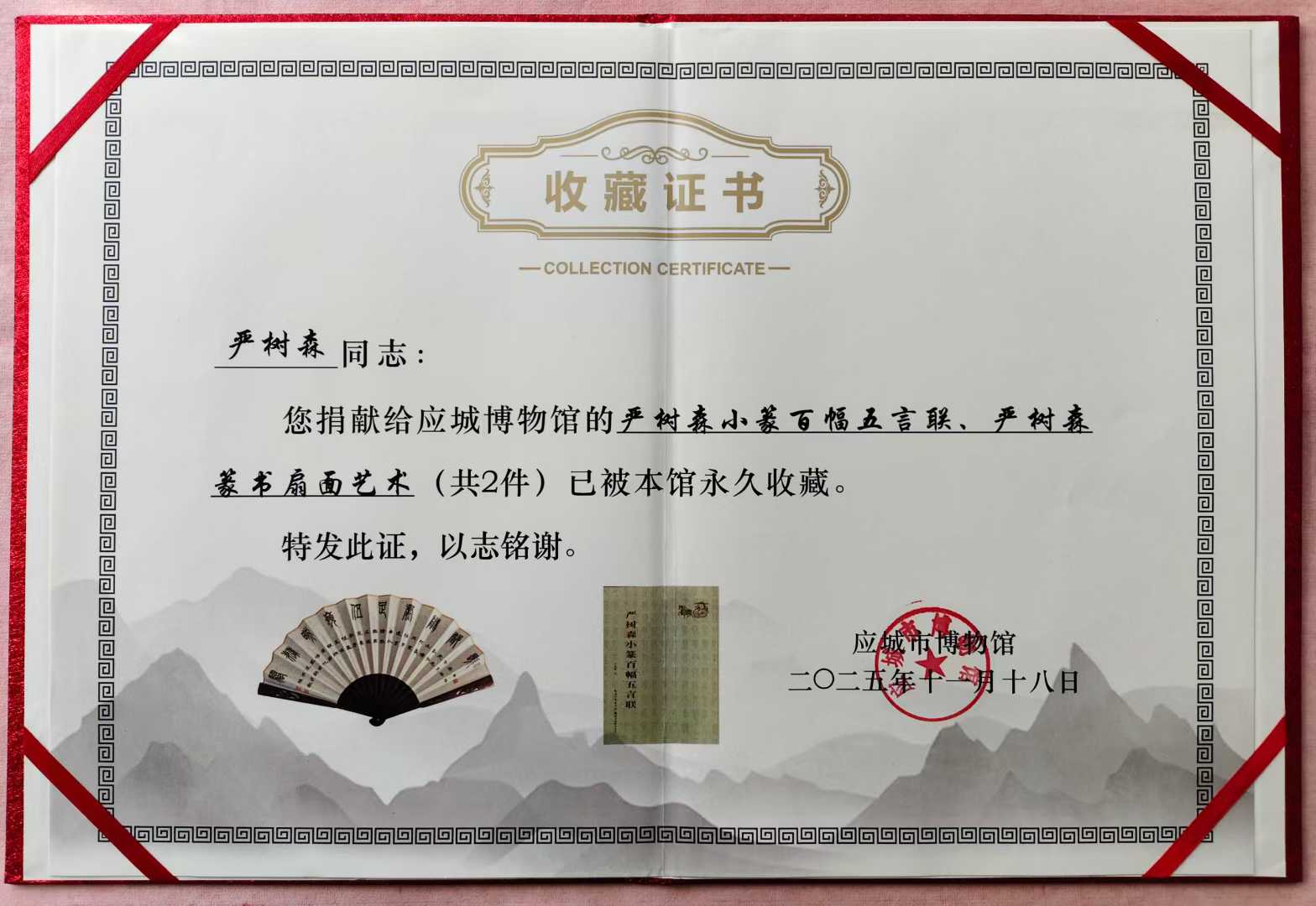 书法家严树森此次捐赠篆书扇面及书籍,不仅丰富了应城市博物馆与档案馆的馆藏资源,更彰显了严树森先生心系地方文化、助力文脉传承的责任担当。书法艺术作为中华优秀传统文化的重要载体,在严树森先生的笔墨中,得以传承与活化。