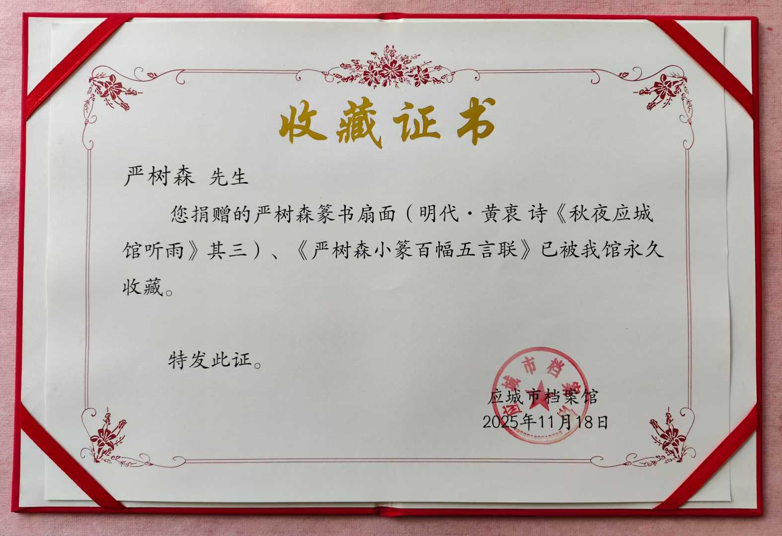 严树森先生以精湛篆书,将《秋夜应城馆听雨》诗中景、理中情融为一体,笔墨流转间尽显文字与艺术的交融之美,该作品被应城市档案馆永久收藏并获颁收藏证书,为地方档案增添了珍贵的文化印记。