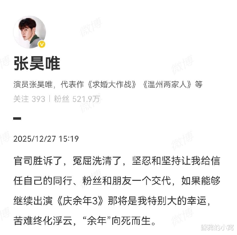 胜诉的那一刻,张昊唯在社交平台发文:“官司胜诉了,冤屈洗清了,坚忍和坚持让我给信任自己的同行、粉丝和朋友一个交代,如果能够继续出演《庆余年3》那将是我特别大的幸运,苦难终化浮云,‘余年’向死而生。”