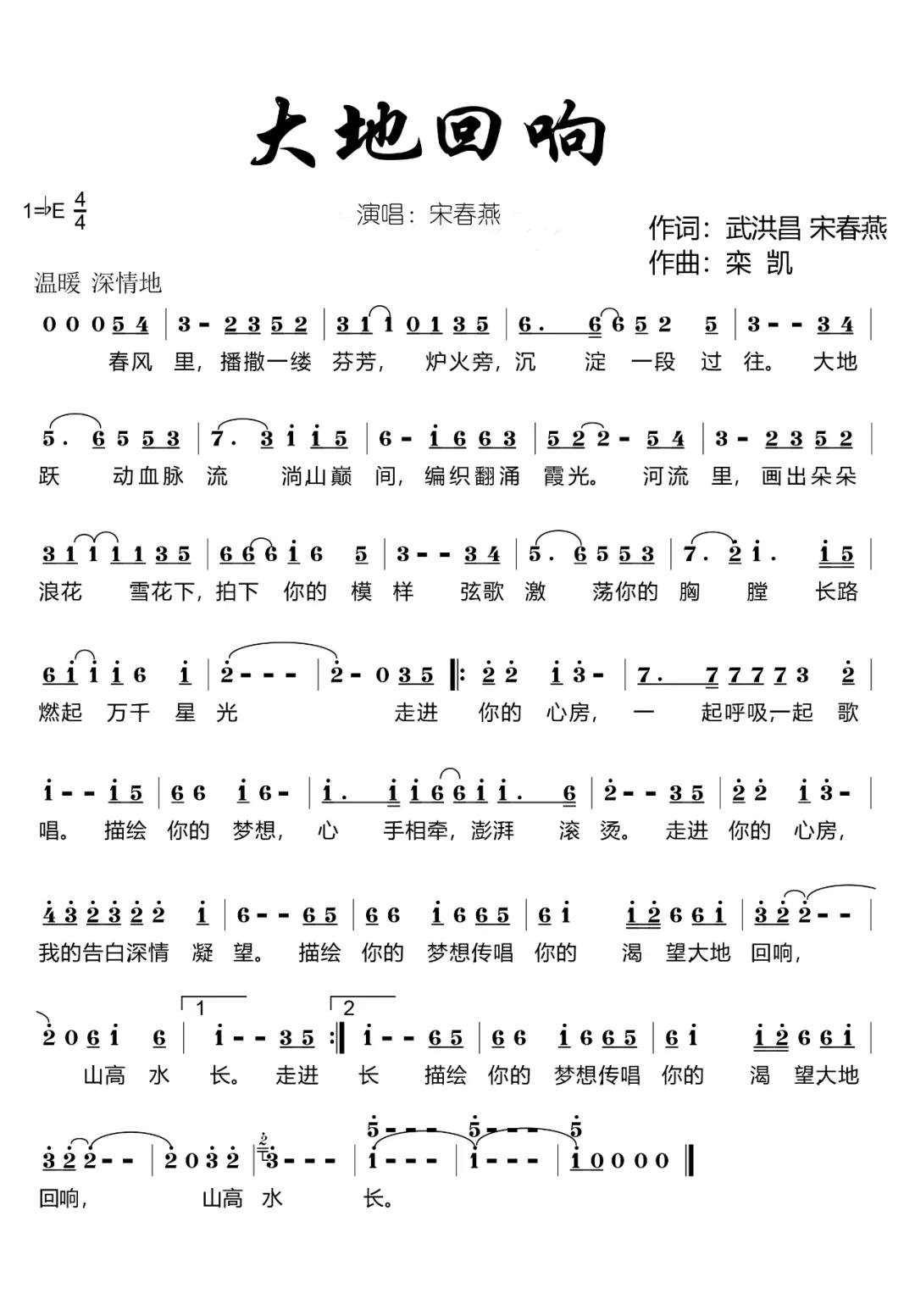 《大地回响》的作词者之一武洪昌,是中共党员、山东省音乐家协会常务副主席兼秘书长,也是一位创作成果丰硕的词作家。他的作品屡获殊荣,如《守望相助》荣获全国学雷锋志愿服务优秀歌曲奖,《人民就是江山》入选中国音协建党百年百首优秀歌曲,《父辈们》获评 2021 中国音协 “听见中国听见你” 优秀作品等。他还策划参与了多部大型音乐舞台艺术作品的创作,此次与宋春燕联手,用细腻且富有画面感的词句,为歌曲奠定了坚实的情感基础。