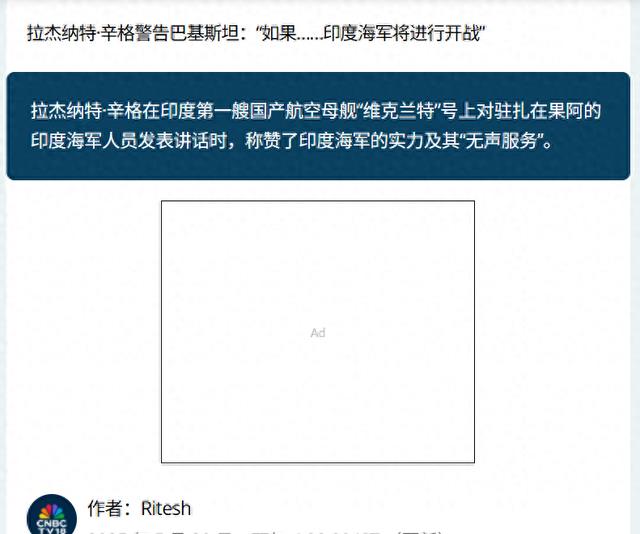 印度国防部长辛格居然声称:“我们的打击如此强大,以至于巴基斯坦开始恳求全世界阻止印度。”印度国防部长辛格表示,当印度空军摧毁巴基斯坦的基地时,印度海军在阿拉伯海的积极部署、靠着优势将巴基斯坦海军限制在其海岸范围内。”印度国防部长辛格在印度国产航空母舰“维克兰特”号上发表讲话时表示,他声称:“辛杜尔军事行动尚未结束。这只是一个暂停,一个警告。”