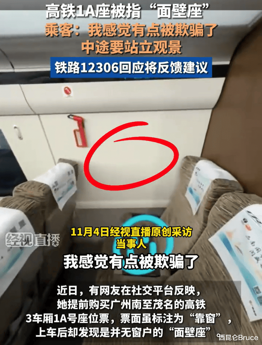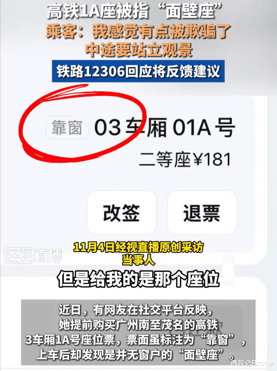 “说好的靠窗呢?”不久前,一位网友提前购买广州南至茂名的高铁票,票面标注“靠窗”的3车厢1A号座位,上车后却发现是“面壁座”,因观景体验不佳,不得不中途站立乘车。