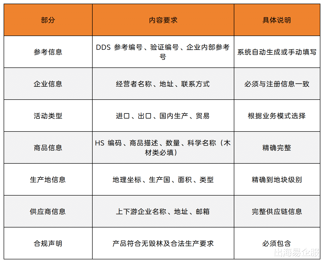 DDS 是 EUDR 合规的核心文件,必须包含以下关键信息: