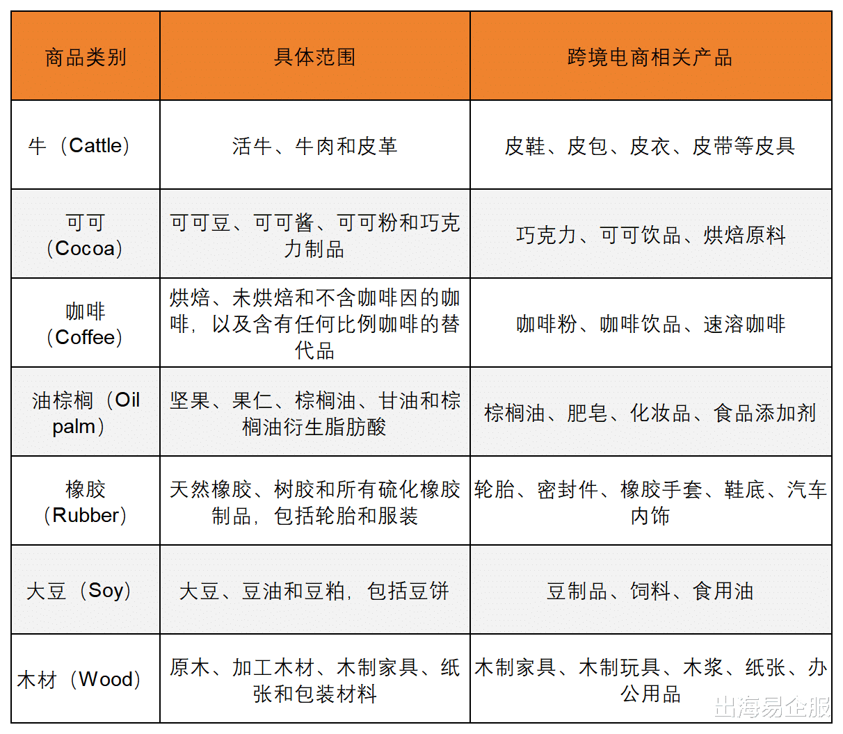 表1:EUDR 法规覆盖七大类核心商品及其衍生产品,具体包括;
