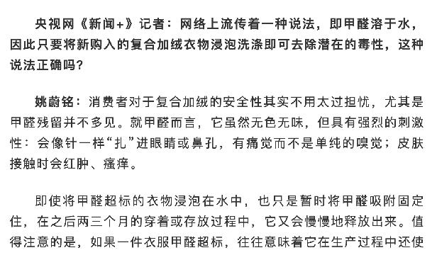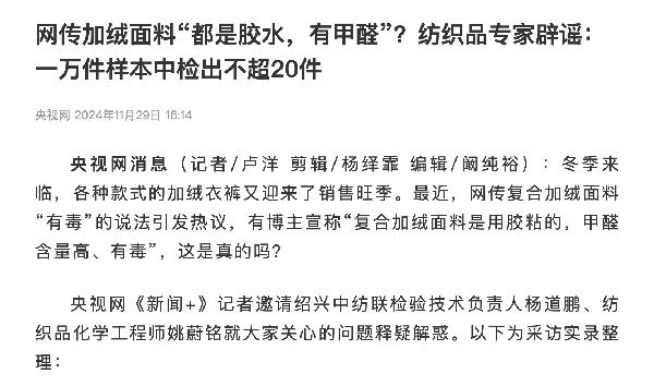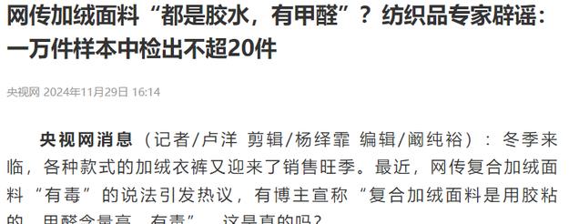 《网传加绒面料“都是胶水,有甲醛”?纺织品专家辟谣:一万件样本中检出不超20件》