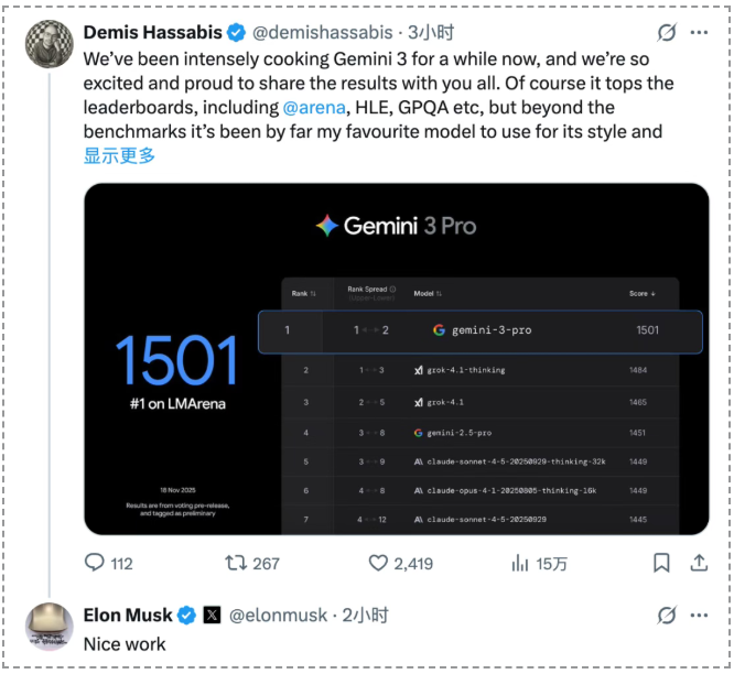 马斯克都出来吹Gemini3了: