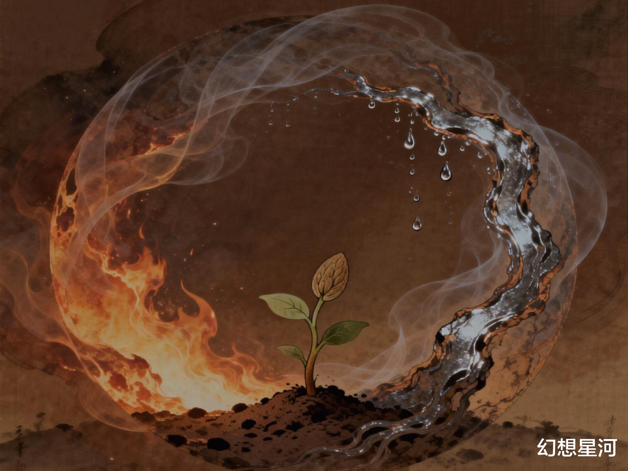 顺口念着金木水火土的我们,直到今天,这也真不是偶然。语言有惰性,这种惰性里裹着的是文化的惯性。两千年前,帝国用这个次序书写诏书、铸造钱币、颁布历书。两千年后,孩童在游戏里默念它,在课本里背诵它,不知不觉中,就重复了一次又一次以金为钥的宇宙启动程序。那柄排在次序里的铁戈,早就生锈了,却仍在暗处闪着冷光。它提醒我们,收获之前,先学会割舍。生长之前,先敬畏终结。它们是先民把宇宙剥落成五片金属、四簇火焰、三捧黄土、两泓水、一枝芽,再用一首五字口诀,教后人如何在生灭之间,活得久一点,想得更远一点。