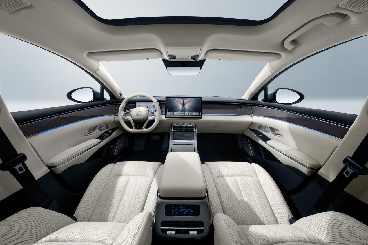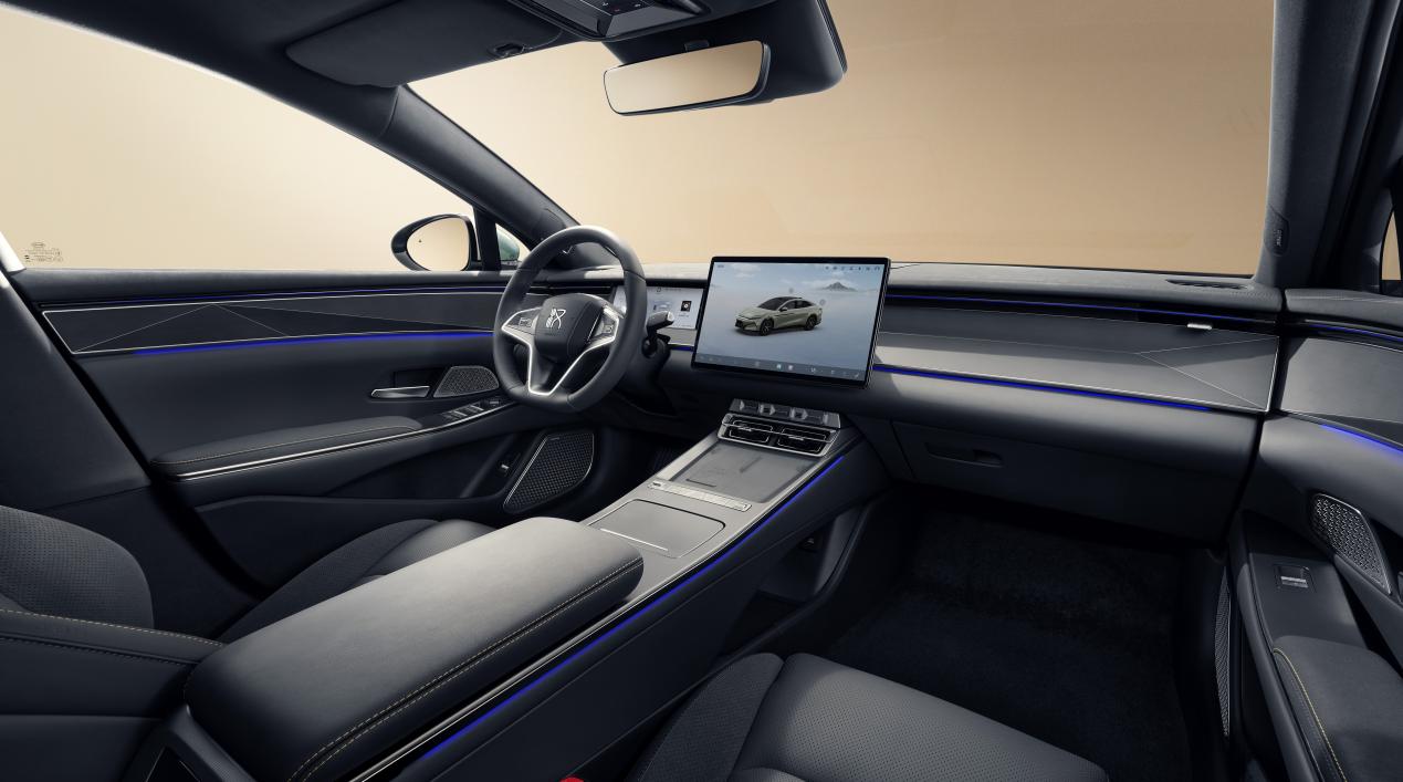 颜值自带辨识度,新增的西子蓝车漆太懂国人审美,强光下泛着珠光白的粼粼波光,弱光时切换成清澈碧蓝,恰如西湖“淡妆浓抹总相宜”;橄榄绿则低调奢华,绿中透金的渐变质感,静置时沉稳内敛,行驶时光影流动。车内更是中式豪华的主场:庑殿顶内饰构型搭配3D竹木饰板,19道工艺打磨的天然肌理触感温润,戟灰运动内饰配虎皮黄缝线,运动与质感完美平衡,坐进来就像闯进“移动的大雅之堂”。