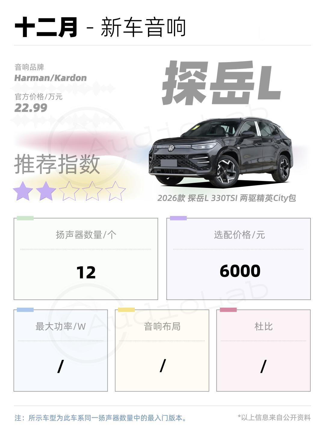2026款探岳L在音响上,依然是分为标配6个原装扬声器、以及选装Harman/Kardon品牌音响两种选择。
