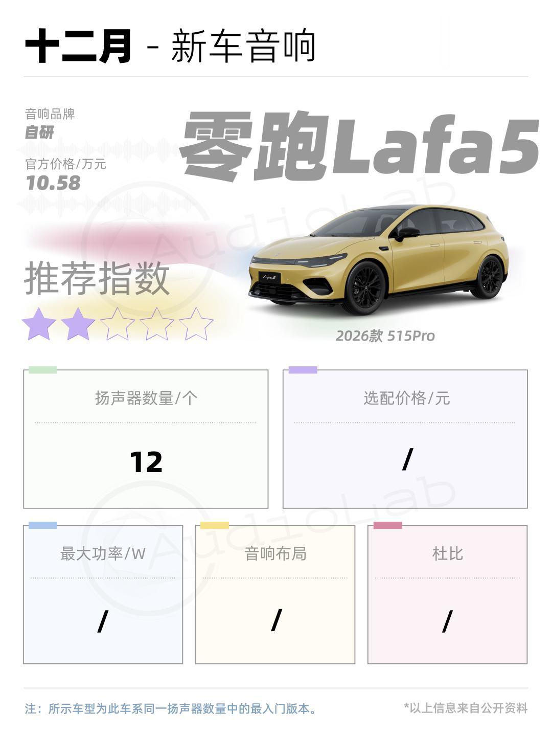 零跑Lafa5在音响上的配置可能初看觉得平平无奇,但参考它10万起的亲民价格来看,12个扬声器、7.1声道、以及AI算法这样的配置,其实可以算同级中,中等偏上的配置。