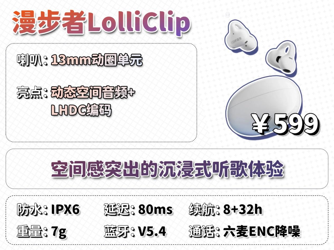 漫步者Lolli Clip在音质上采用13mm动圈单元,确保声音拥有饱满的基底与足够的响度;动态空间音频技术能营造出开阔且富有层次的声场,增强听歌的沉浸感;同时支持LHDC高清编码,能传输更多声音细节,使人声清晰、乐器分离分明。在佩戴上采用C形桥与多曲度软梁,结构稳固贴合耳廓,但单耳7克的重量,在长时间使用后会明显感到累。在性能上具备六麦通话降噪,通话非常清晰;支持IPX6级高防水,并拥有一拖二连接与持久的综合续航能力,不过音量较大时存在可察觉的漏音情况。