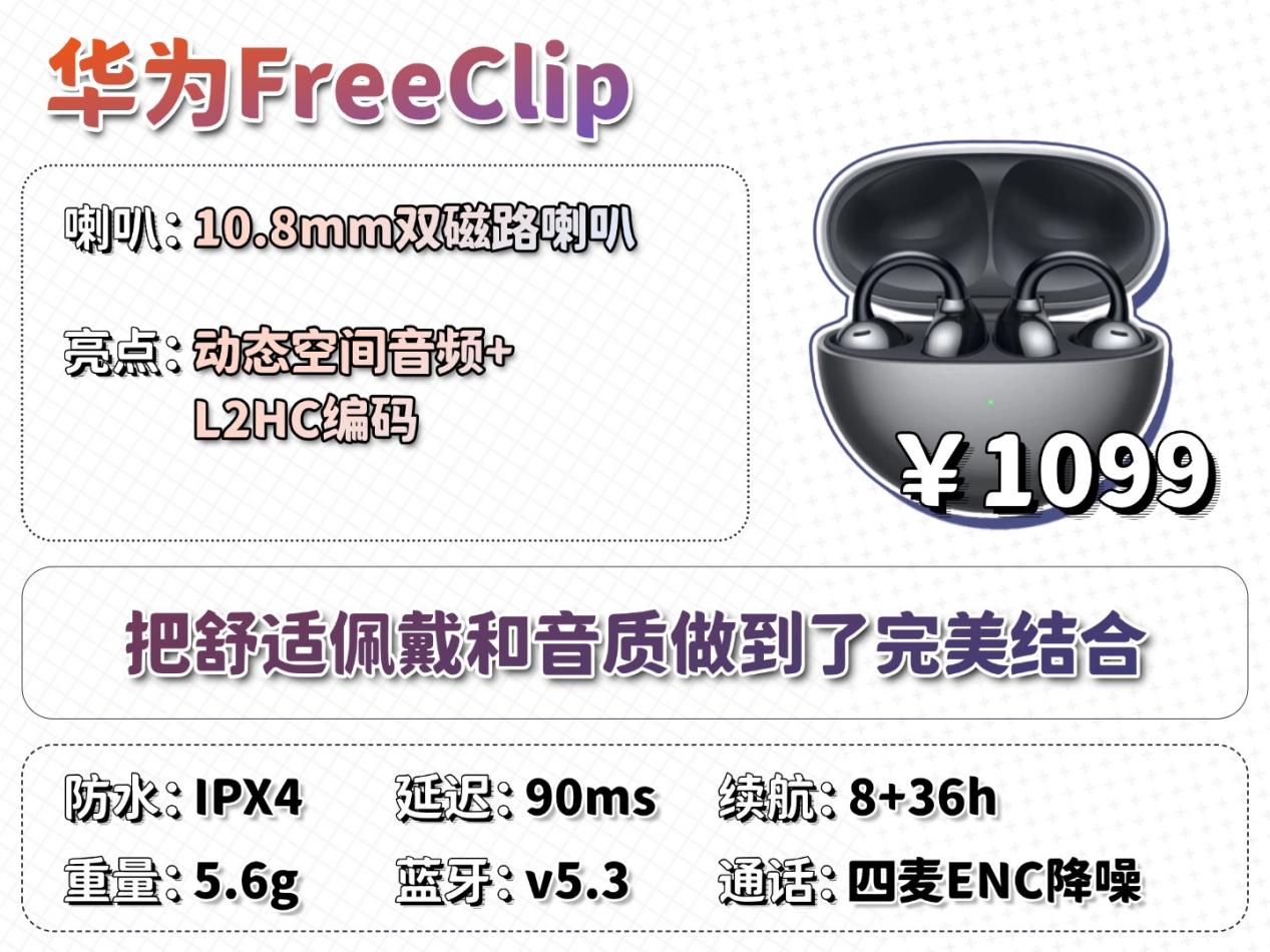 华为FreeClip在音质上采用双磁路喇叭,增强驱动力使声音扎实饱满;动态空间音频技术拓宽了声场,营造出开阔立体的听感;再搭配华为设备,会有L2HC高清编码能进一步提升声音细节与纯净度,整体音质表现出色。佩戴上通过C形桥与人因工程设计,5.6克机身轻盈且贴合耳廓,长时间佩戴舒适。性能上支持一拖二连接,切换便捷;具备四麦通话降噪,通话清晰度高;并且有着日常防水与满足一天使用的持久续航,整体表现十分值得推荐。