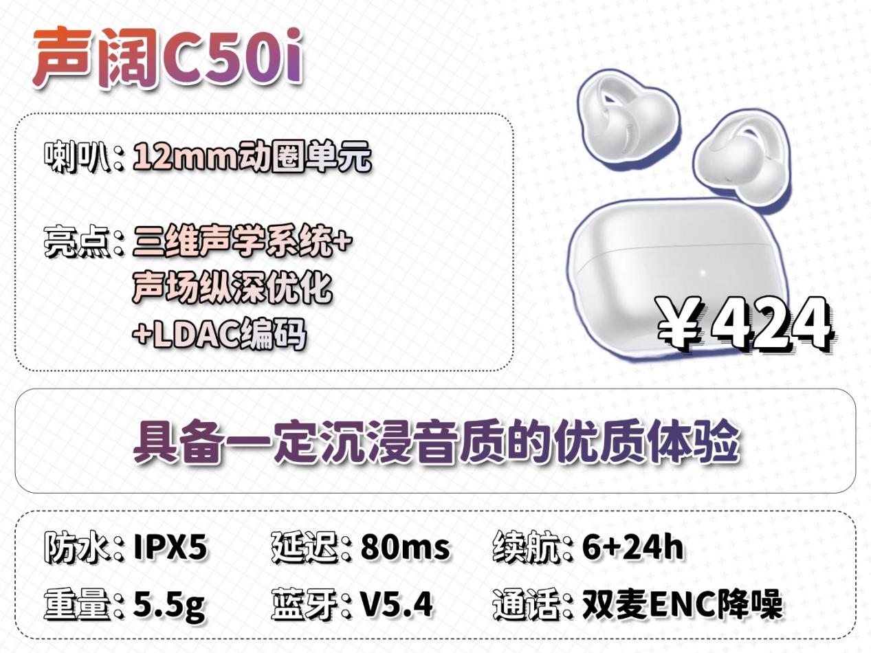 声阔C501在音质上搭载12mm动圈单元,配合三维劲浪声学系统显著增强了声音的立体感与氛围渲染;还有声场纵深优化技术进一步拓展了听音的空间层次,使结像更清晰;同时支持LDAC高清编码,能保留丰富的音乐细节,整体听感饱满且富有层次。佩戴上采用柔性力学架构,5.5克机身贴合稳固,但舒适性一般,长时间使用耳朵会有压迫感。性能上具备双麦通话降噪,日常通话清晰;支持IPX5日常防水;28小时总续航能满足一天使用。