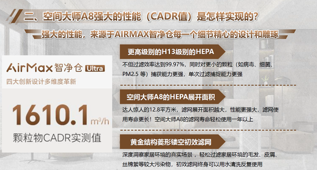 第一次见到新颐A8,就被它那霸气的外观震慑到了,不过这可不是虚有其表。新颐A8的净化能力简直强到离谱!颗粒物CADR实测值达到了1610.1m³/h,甲醛CADR也高达1092m³/h,这数据直接把一众竞品甩在身后。