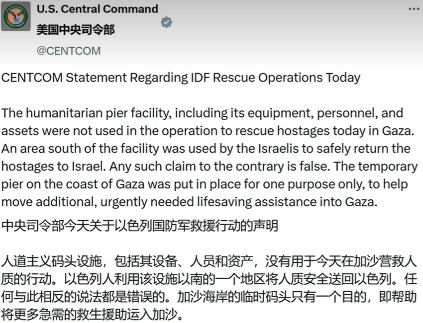 有消息指出,此次军事行动或许有老美参与,对此,美国慌忙发布声明,称以军的营救行动他们并未参与,其码头仅用于运送人道主义物资,因以色列在努塞拉特难民营的行动致使其名声不佳,老美也不愿与之有牵扯。