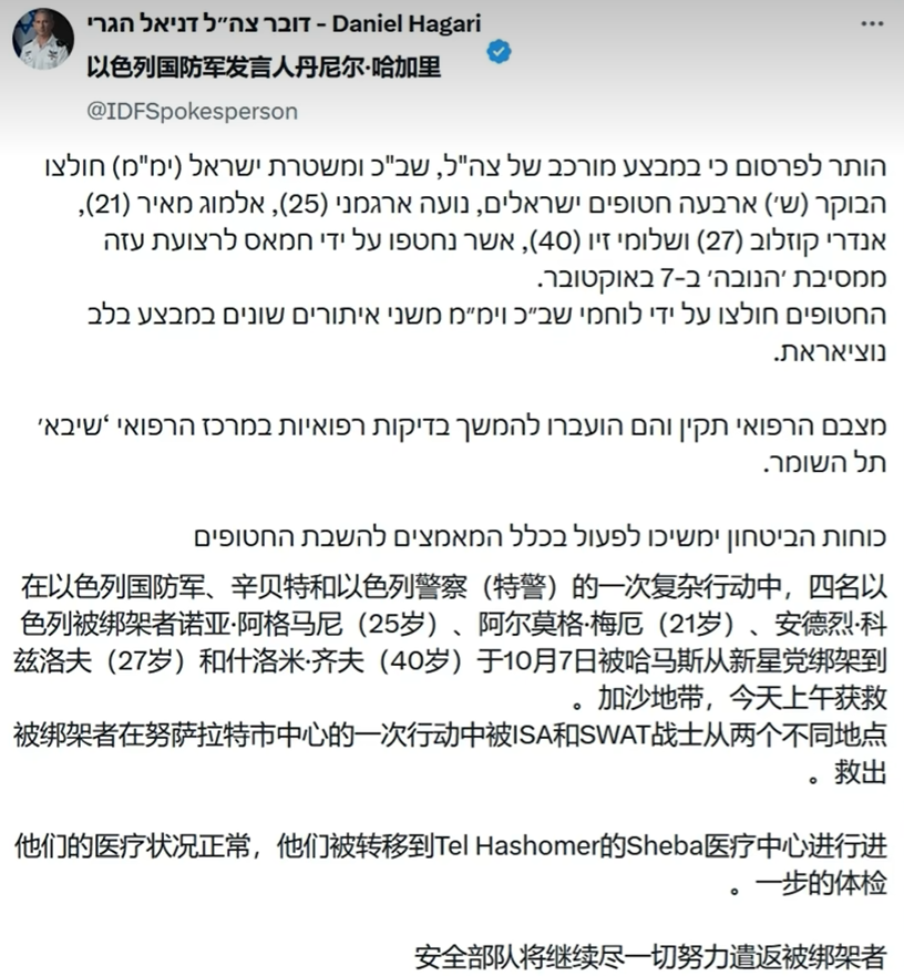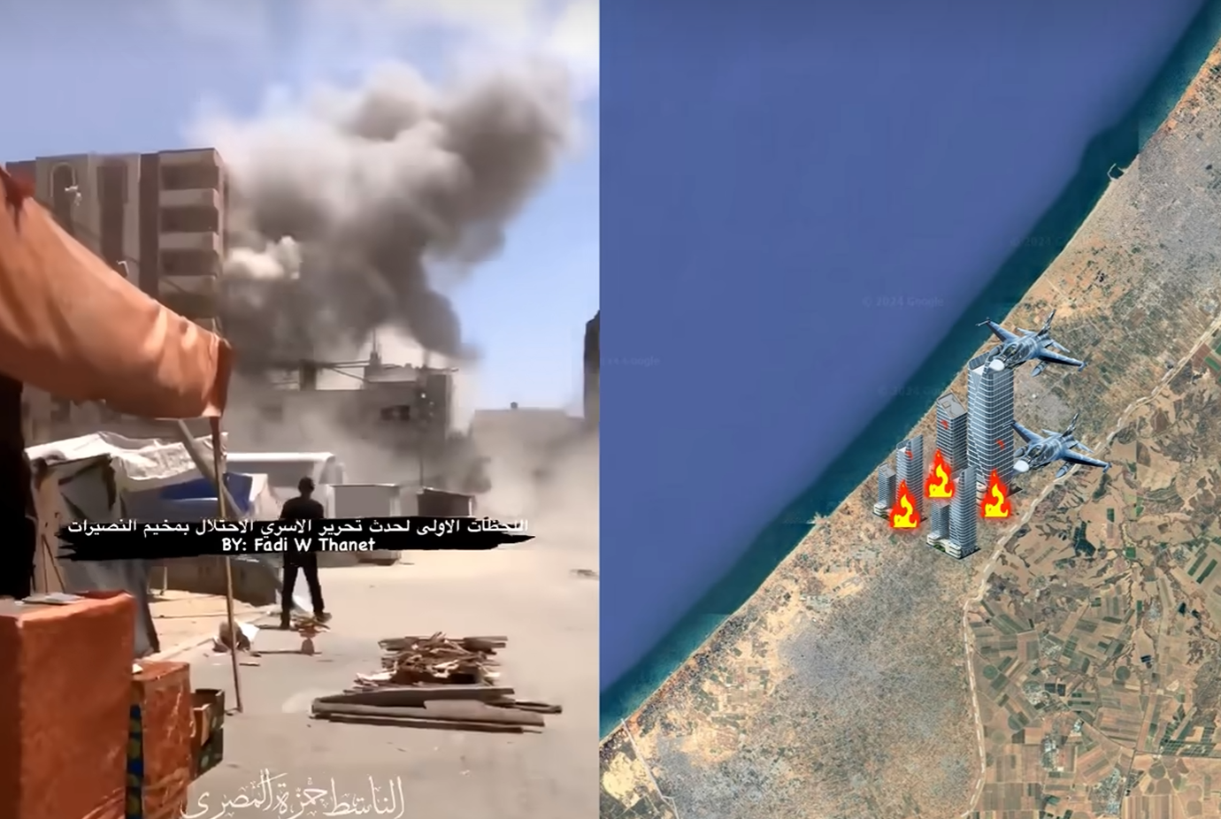 同时,以军阿帕奇直升机一直在空中盘旋,并使用机枪扫射努塞拉特难民营。随后,以军兴贝特和雅马姆特种部队潜入努塞拉特难民营,宣称解救了 4 名人质,这些人质最终在老美位于加沙的新港口乘直升机撤走。