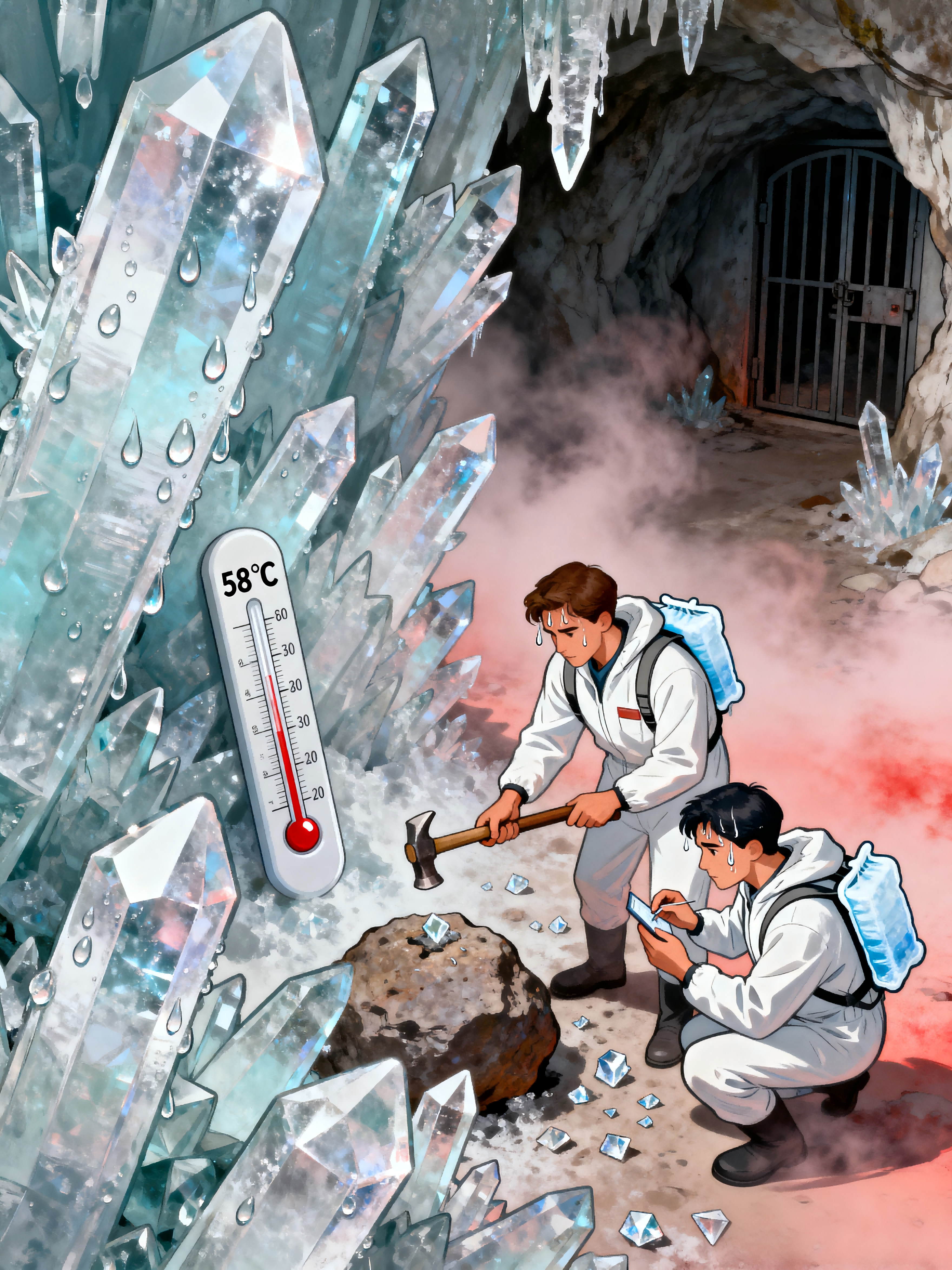 洞穴里的温度一年到头都能有58摄氏度呢,湿度超级高,都超过90了,那模样就跟一个“地狱蒸笼”似的不过反倒给水晶生长当成温床。