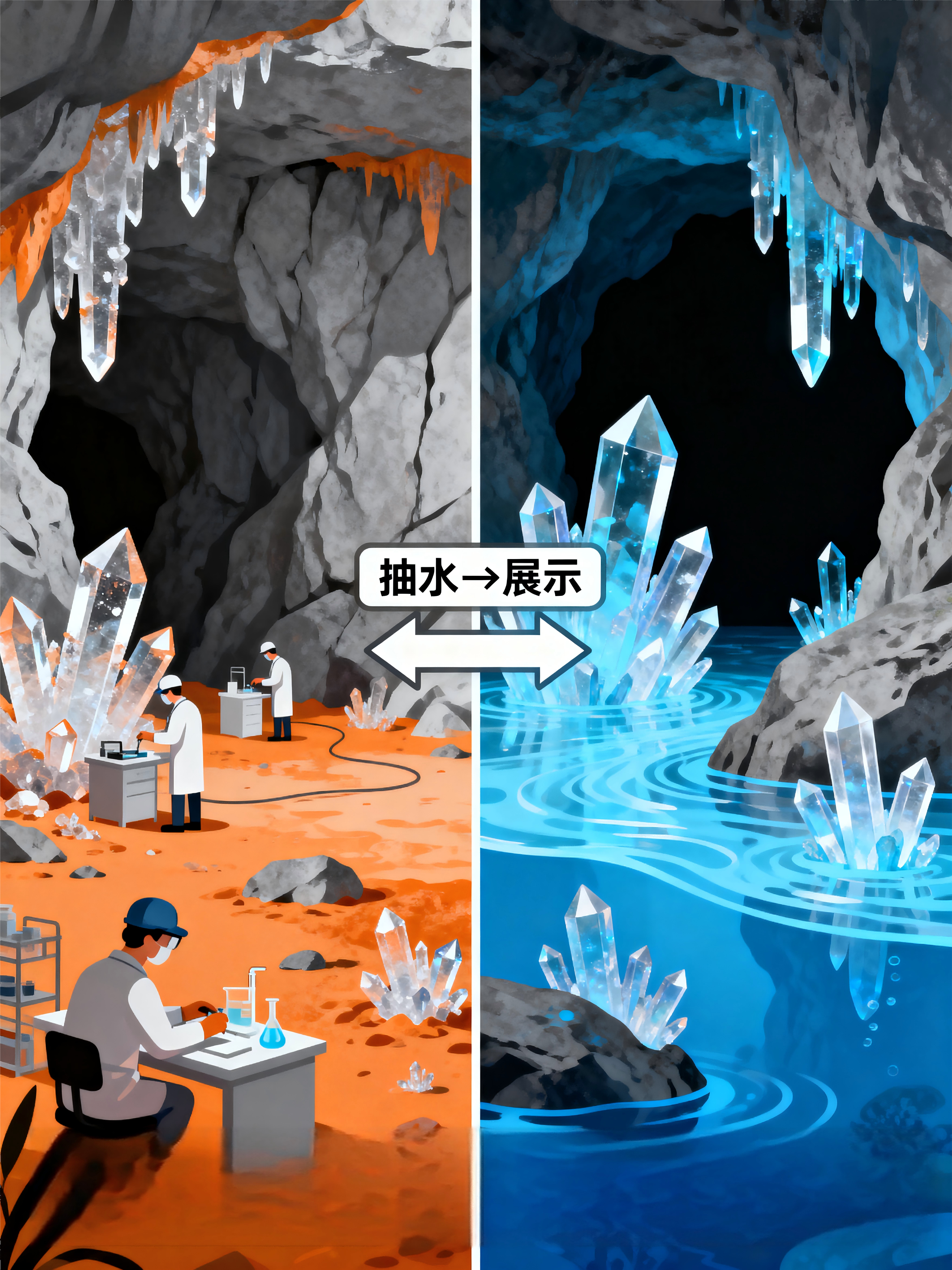要是不抽水了,那洞穴就又会被水给淹了,水晶呢还会在黑暗当中,一直安安静静地生长着。