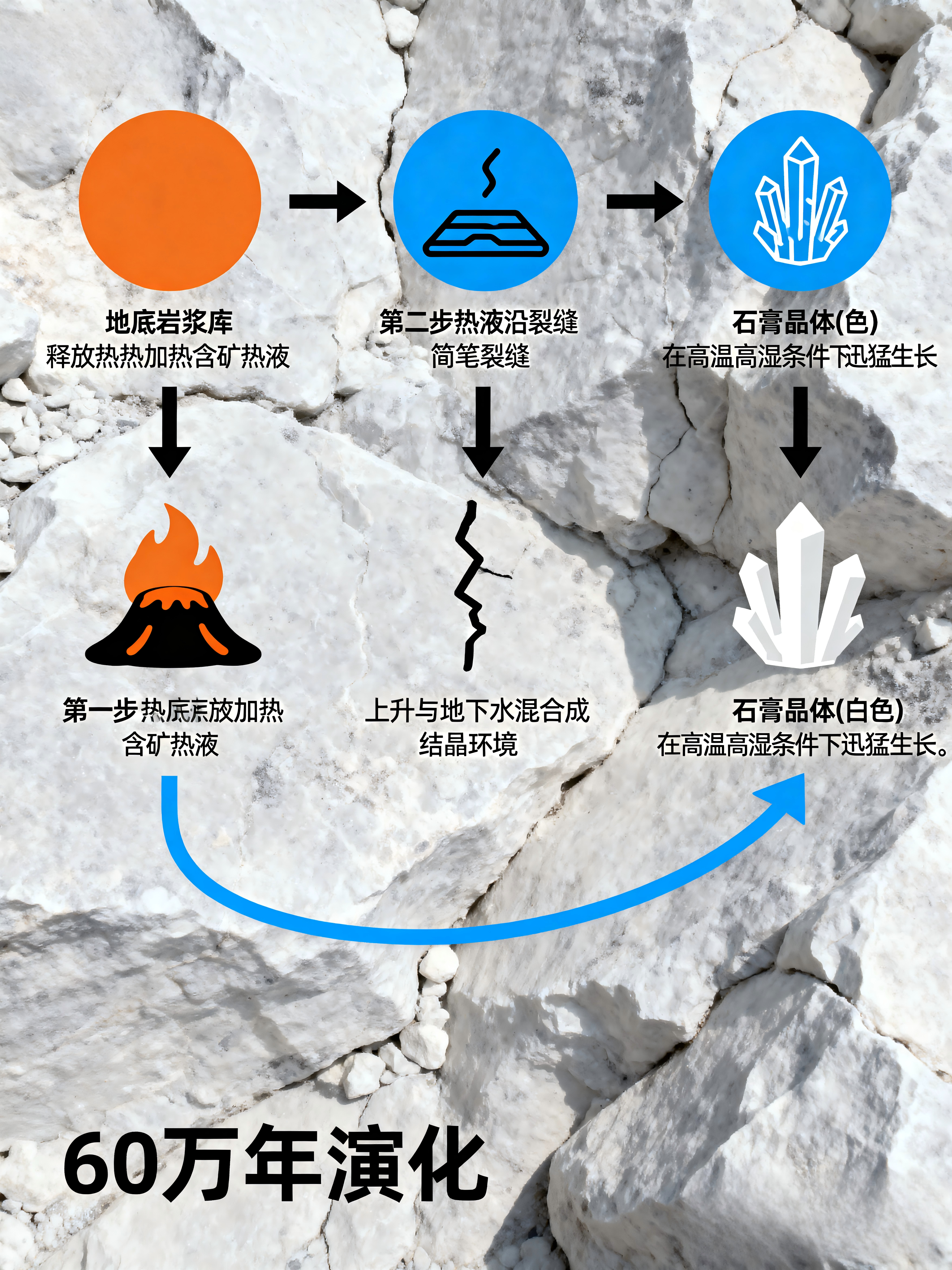富含矿物的热液自地底裂缝汩汩渗出,与洞内之水相互交融,造就了堪称绝佳的结晶环境。