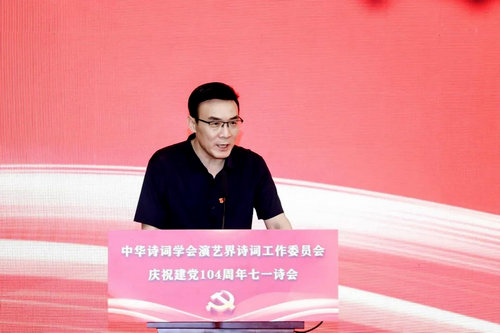 中国作协诗歌委员会主任吉狄马加在致辞中表示,我们怀着无比崇敬的心情,在这里共同庆祝中国共产党成立104周年。104年来,党带领全国人民书写了气壮山河的壮丽史诗。而诗歌,作为时代的心声、民族的灵魂,始终与党的光辉历程同频共振,记录着信仰的力量、奋斗的足迹和梦想的绽放,从革命年代到建设时期,从改革开放到新时代,诗歌始终以最炽热的情感,讴歌党的伟大征程,礼赞人民的伟大创造,愿我们在党的光辉指引下,继续谱写属于演艺界诗工委、这个伟大时代的华美乐章。