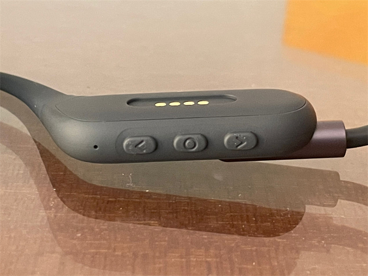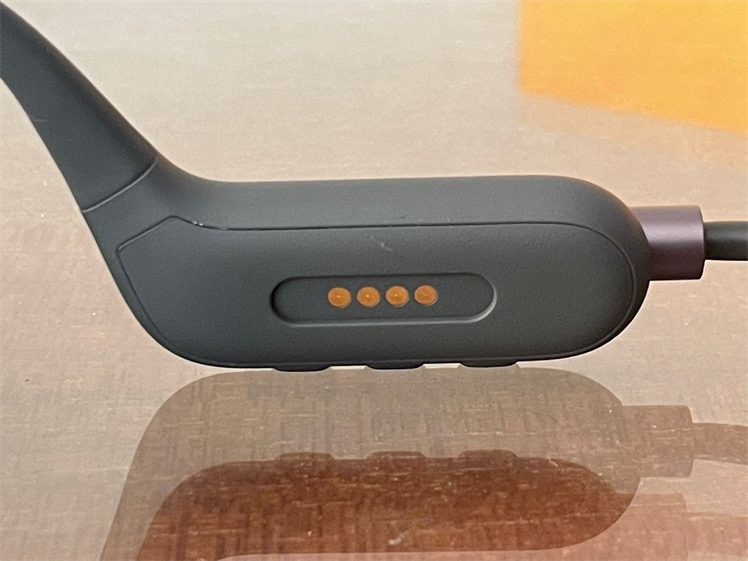在右耳柄内侧设有4个充电的磁吸式接触点,这样可以做到更有效的防水。同时耳机内置 230mah 的电池,搭配蓝牙5.3低功耗芯片,在正常使用下,耳机充满电可维持8小时的使用。