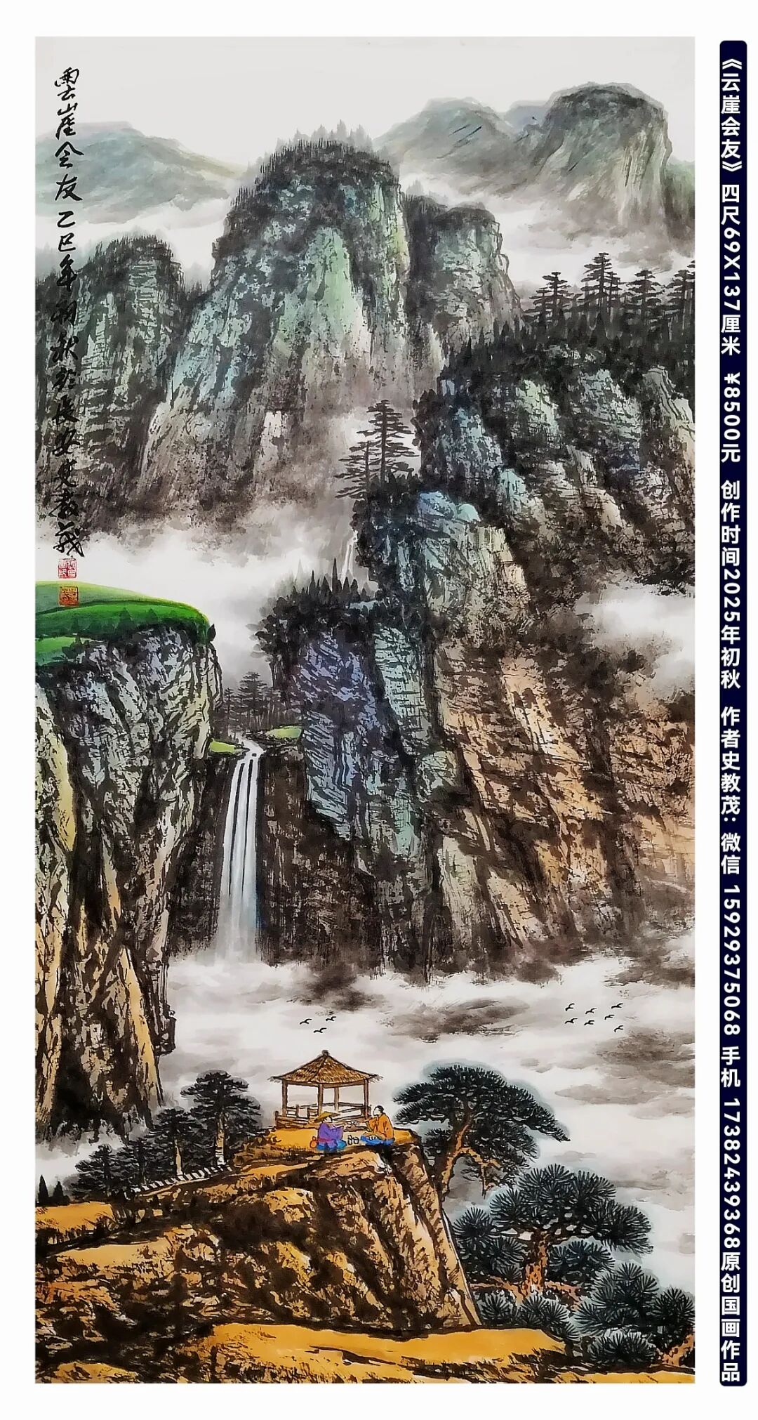 艺术风格与传承: 史教茂先生笔下的作品雄伟壮丽,气势万千,自成一格,为世人所赞誉。欣赏他笔下的飞瀑图,你可以感受到一种磅礴之气从画面中悠然而起,若风旋水泻、毫飞墨喷;似闪电雷鸣、惊涛扑岸;又如狂飙戾天、浓云惨淡...,这正是傅抱石的画风,于磅礴大气中见精微,于蓬勃生机中显率真。 史教茂先生画山水,尤善于发挥用笔效能,以笔尖、笔肚、笔根等的不同运用来表现自然山川的不同变化。云水为陆俨少绝诣,有雄秀跌宕之概。勾云勾水,烟波浩淼,云蒸雾霭,变化无穷。 史教茂先生一生致力于山水画,作品长于飞瀑流泉、风帆、霜林;笔墨氤氲,水意蒸融,苍劲有力,气势雄壮。他以全景作构图,从上到下,山峦层叠,林木扶疏,尽收眼底,表现出了深远的空间感和气韵感。拜观史教茂先生的作品,给人一种酣畅淋漓之感。意空灵,图壮阔,听松涛阵阵,观雾霭茫茫,感受云卷云舒。亦有“鸢飞戾天者,望峰息心,经纶世务者,窥谷忘反”之超脱,又如山中高士,俯仰间,阅尽世间万物轮回,给人酣畅淋漓之感。 史教茂先生的山水画作,一草一木、一山一石皆若风骨外化、灵性活现,又似云蒸霞蔚,气象升腾。蓦然感受到:生命在律动,自然在游走,真与善、灵与魂,在参差渗透,竞相净化,身心如沐春风,心田如饮甘霖史教茂先生的作品倾情于山水,钟情于笔墨,画作中,形态浑厚苍润,气势恢宏中正。他用水、墨与彩的有机融合,使画面喷发出极具冲击力的视觉感受,真可谓气势凌云,波澜壮阔。 借山水澄怀观道,史教茂先生的画作,业精则得于勤,对笔、墨、纸、水的有机结合和巧妙运用,得益于对中国画的深刻理解和感悟。尤其是在彩墨山水和写意花鸟的表现形式上,更显示出其独特的个性。他的作品以创新入笔,以大气夺人,作品中生活气息浓厚,寓意幽深,符合中国道教文化中人与自然和谐共生的规律,凝聚着厚实的画风,每幅作品都暗藏着深远的美好祝愿和对祖国山河的美好祝福。