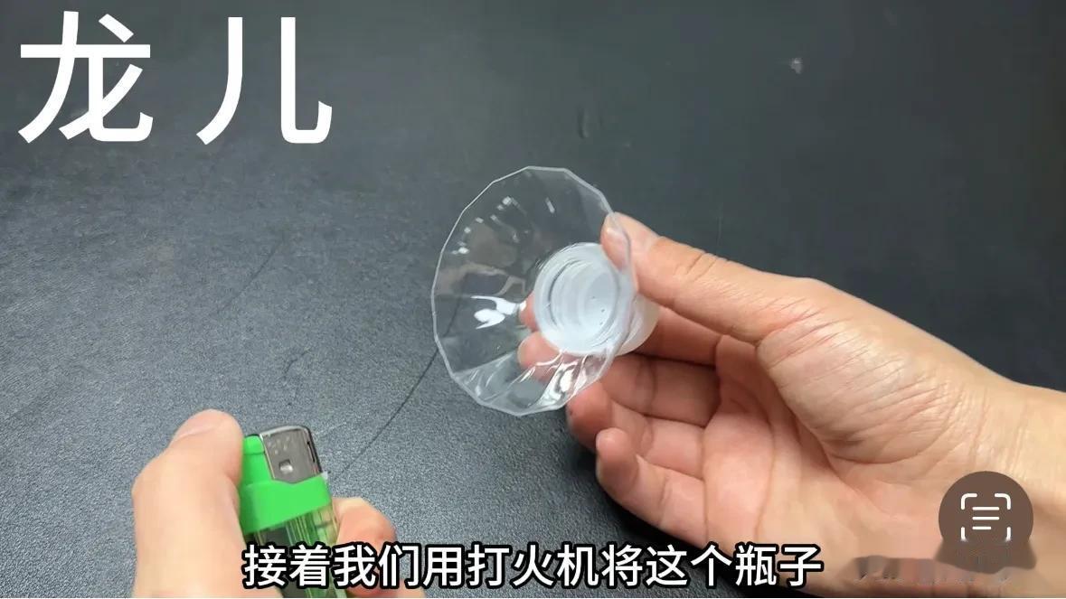 如果是在马路边捡到的矿泉水瓶子,就不需要擦的这么干净,完全擦干之后,就是这个样子的顶部也要给它擦干,像这个样子。接下来我们用打火机将这个瓶子瓶口剪掉的这个边缘处给它烤一烤,因为剪过的地方它会变得有一些倒刺,很容易割到手,后期用起来也不方便,也没有那么好用,用打火机来回烤一烤,边缘处可以把上面的倒刺、毛刺烤掉,这样呢,摸上去就会非常的光滑,后期用起来也更加的方便省事儿。