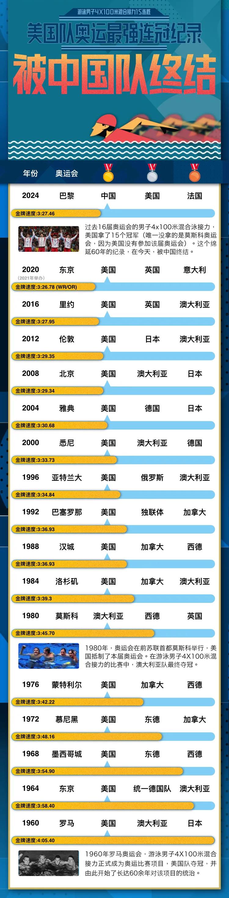 从1960年罗马奥运会开始,男子4x100米混合泳接力成为奥运会正式比赛项目,美国队夺冠。
