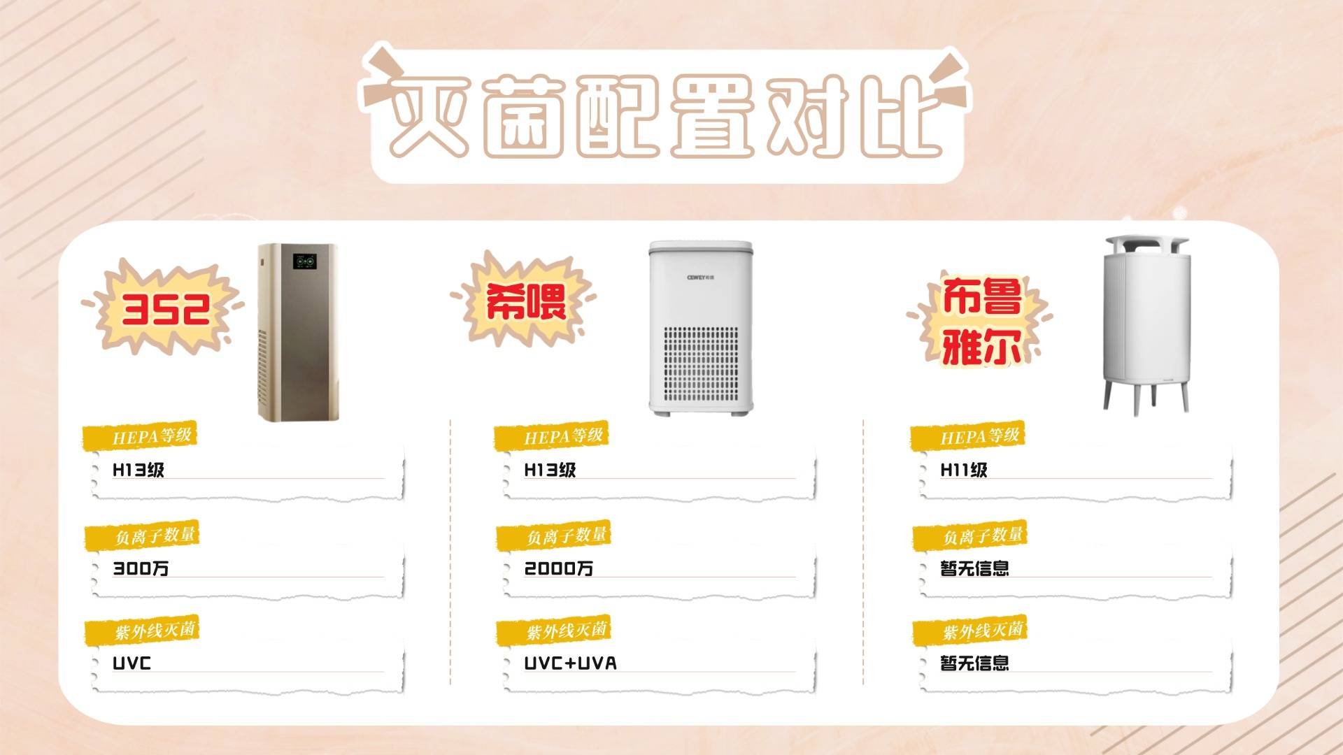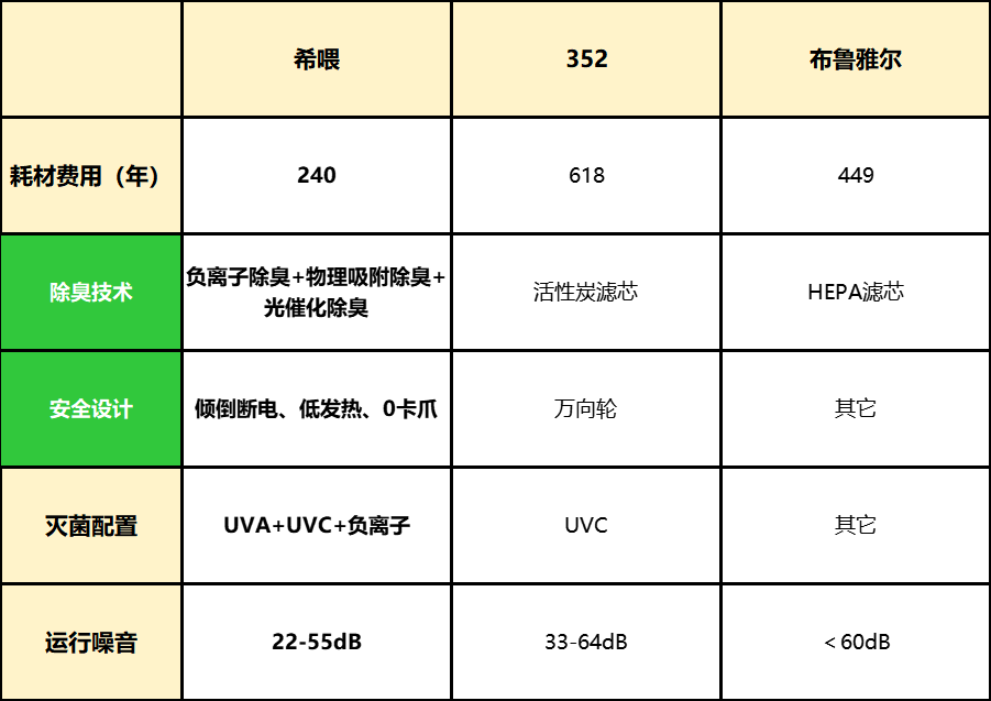 相比之下,352采用了基础的UVC灭菌技术,还能释放300万负离子,尽管具备一定的杀菌能力,但其覆盖范围和效率均不及希喂,表现稍显逊色。而布鲁雅尔则并未标明是否有UVC灭菌技术和负离子,灭菌效果有待考证。