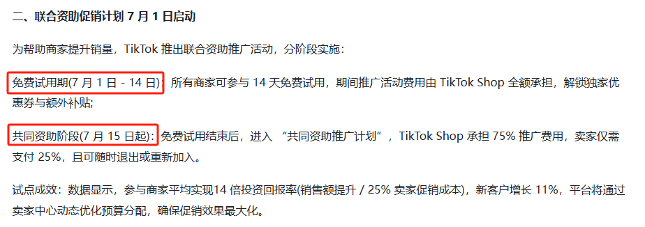 TikTok Shop推出了“联合资助推广计划”。在初始免费期内,推广费用由平台全额承担;进入正式阶段后,平台仍会承担75%,卖家仅需支付25%。