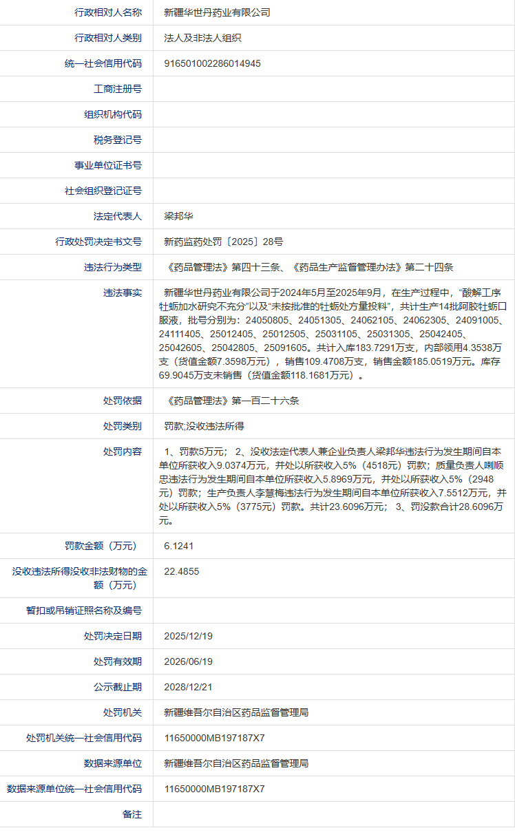 近日,新疆维吾尔自治区药品监督管理局公布行政处罚决定(新药监药处罚〔2025〕28号),新疆华世丹药业有限公司因在阿胶牡蛎口服液生产中存在工艺违规、未按批准处方投料等违法行为,被依法处以罚款6.1241万元、没收违法所得22.4855万元,罚没合计28.6096万元,相关责任人员也被同步追责,凸显了药监部门严抓药品生产质量、守护公众用药安全的坚定立场。
