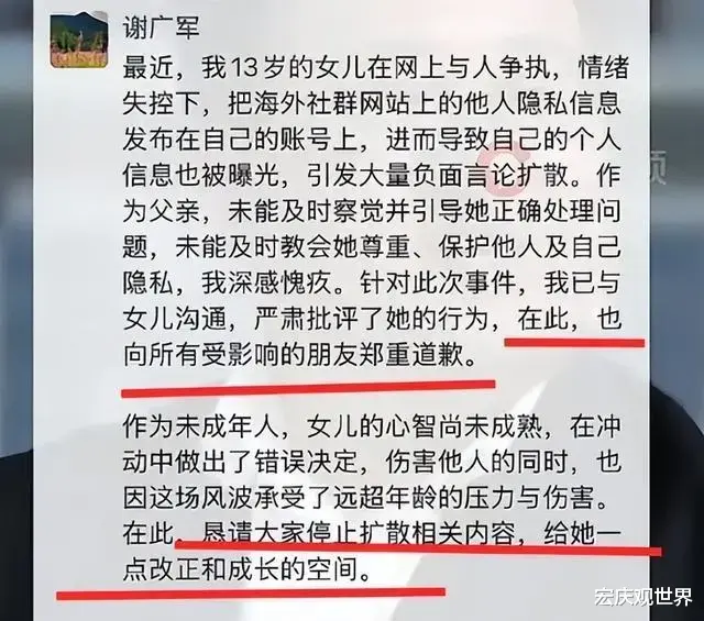 这事儿越闹越大,百度副总裁谢广军终于坐不住了,在3月17日,在微信朋友圈发布了道歉声明。他说,涉事网友是他女儿,当时是情绪失控,才把从海外社群网站上获取的他人隐私信息发布到了自己的账号上。他还说,作为父亲,他没能及时察觉女儿的不当行为,也没引导她正确处理问题,更没教会她要懂得尊重和保护他人以及自己的隐私。他还提到,他已经和女儿进行了沟通,严肃地批评了她的所作所为,同时也恳请网友们能够停止继续扩散相关内容,希望大家能给这个未成年人一个改正错误、慢慢成长的空间。