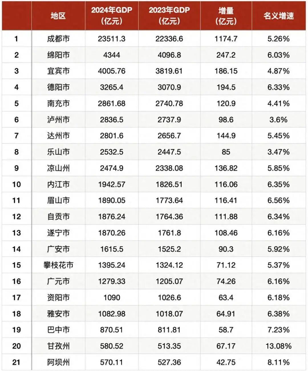 2024年,成都以23511.3亿元的GDP总量独占36.3%,相当于绵阳、宜宾、德阳三个经济副中心的总和。