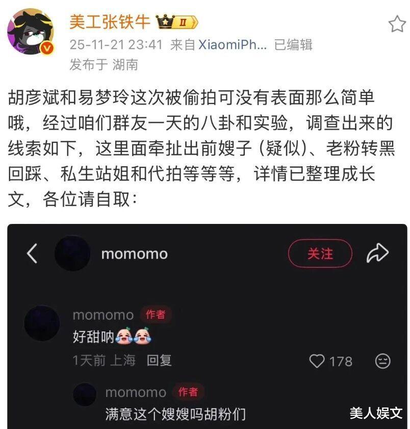 一线狗仔阳阳在 22 日中午发布独家爆料,称早在 10 月 17 日就已拍到胡彦斌与易梦玲在乌镇的亲密画面:两人在乌镇西栅景区内牵手散步、河边拥吻,深夜共同返回某临水民宿,全程未做任何避嫌措施,同行还有胡彦斌的助理和易梦玲的闺蜜。阳阳透露,原本计划在 11 月底逐步放出素材,但因第三方提前泄露马尔代夫视频,才被迫提前曝光乌镇片段。