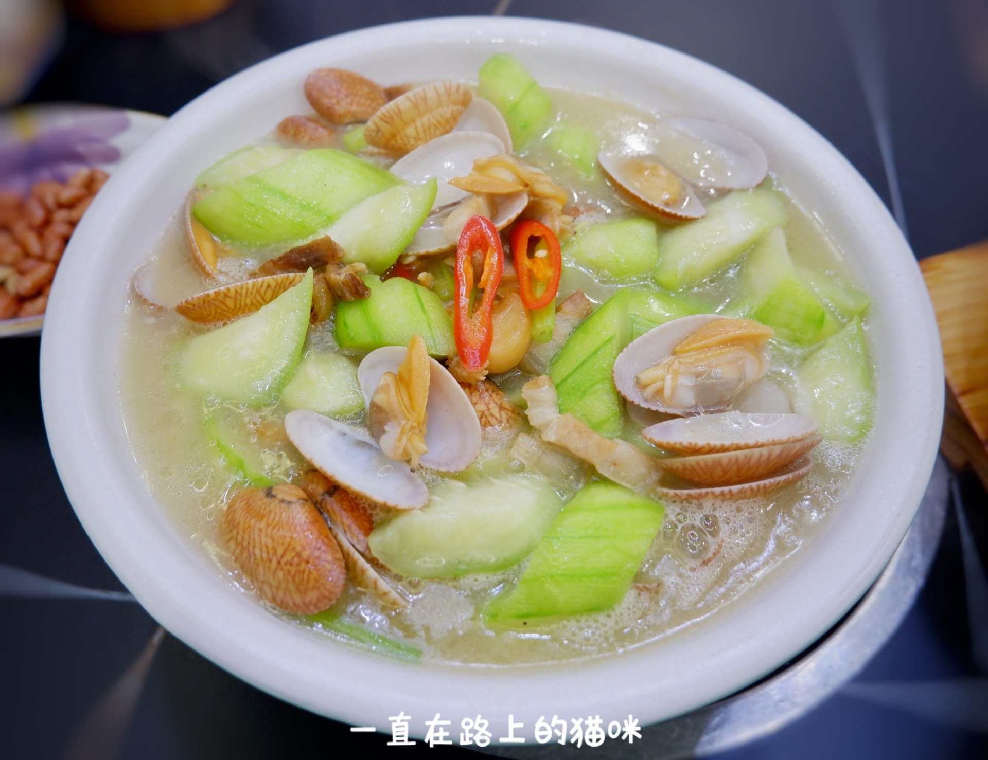 闽南人习惯总要有个青菜收尾,但还是不能舍弃海鲜,所以点了贝壳类的王者油蛤,嫩滑的丝瓜,鲜嫩的油蛤,里面的汤也很好喝。