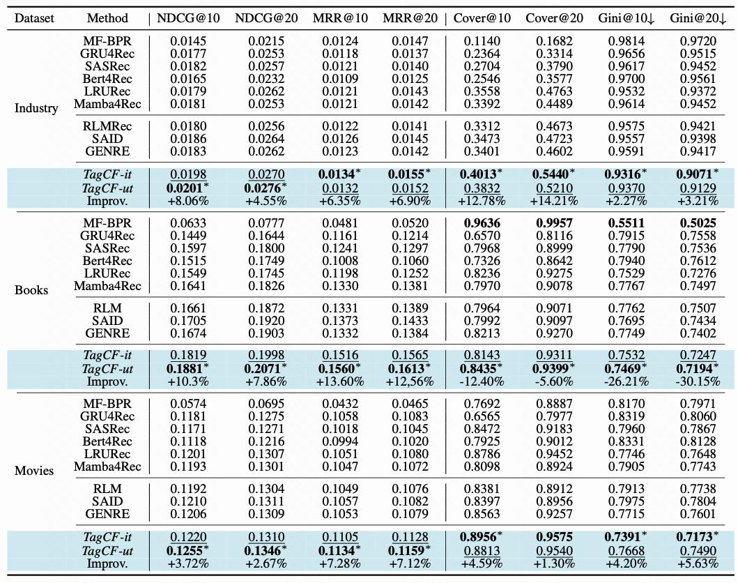 TagCF-util:仅使用 T(0),维持茧房内特性,注重提升准确度。 TagCF-expl:使用 T(0) 和 T(1) 的并集,突破茧房并进行相关新特性探索,注重提升多样性。 实验离线实验