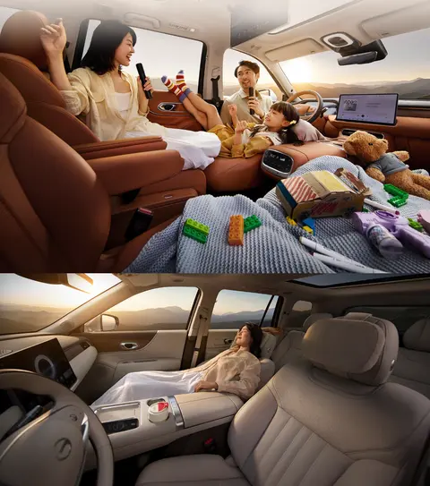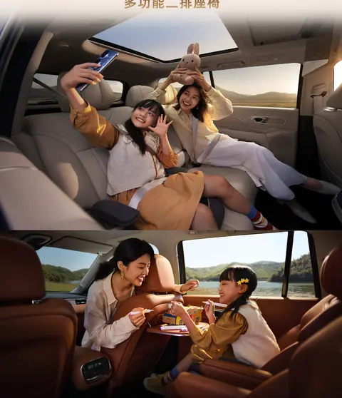 生活场景中,三口之家我强推五座版。带孩子去幼儿园时,后排空间大得能放下安全座椅加玩具箱;周末去露营,后备箱轻松装帐篷烤炉,二排座椅还能135°放倒当临时床(老婆午睡直夸舒服)。多成员家庭就选六座:第三排不鸡肋,148°靠背倾斜角度让老人或孩子坐2小时都不累,中央过道方便进出。实测乘员舱玻璃面积4.62m²,视野超广——高速上,家人看窗外风景不压抑;城市晚高峰,全景感减少了车震焦虑。另外,富氧新风系统和等离子净化器是加分项,北京雾霾天开车,车里空气比家里还清新。