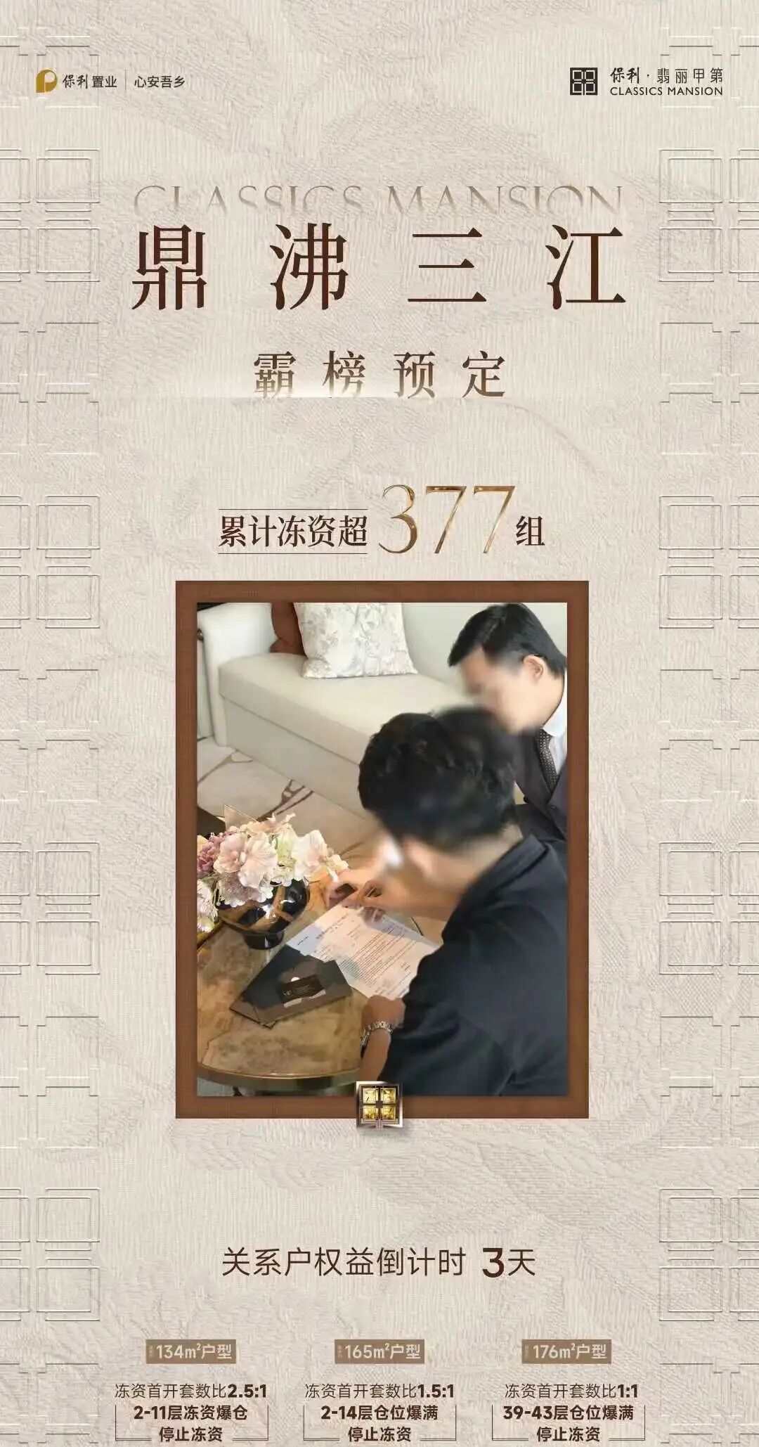 荔湾白鹅潭的保利·翡丽甲第,主推的建面约134、165、176㎡户型,累计冻资超377组。