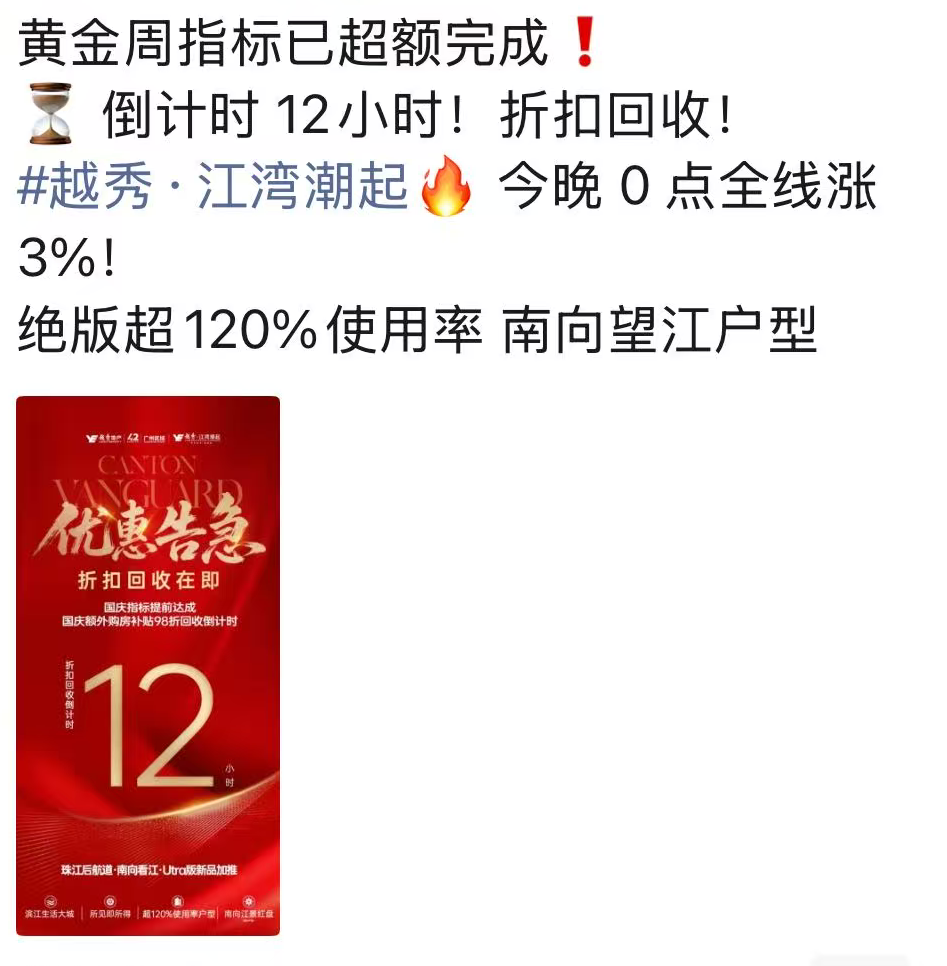 海珠的越秀·江湾潮起,使用率超120%,国庆指标提前达成,10月8日0点后全线涨价3%。