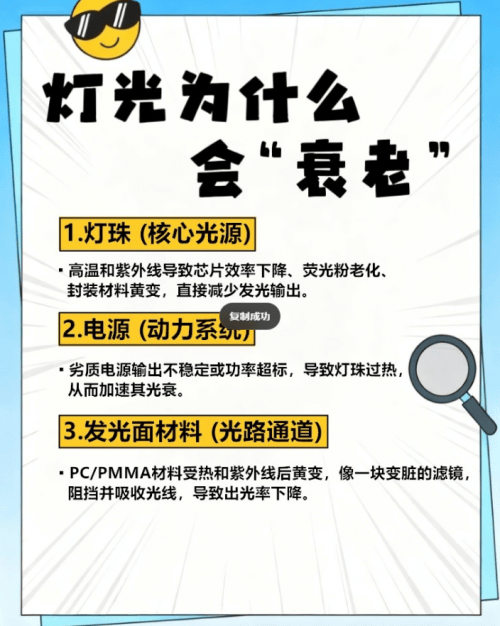 劣质灯珠寿命短、散热差,刚买时还行,用半年后觉得越来越刺眼,光线越来越暗,视觉要不断重新适应,影响视觉效果。