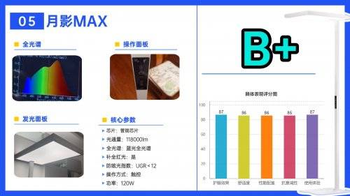 月影是一个在某红薯上宣传的也比较好的护眼大路灯,这款MAX版的大路灯从外观上比较重工艺,采用的是一体式的发光面设计,内置全光谱灯珠,虽然是蓝光激发全光谱,但实际蓝光峰值在0.6左右,实际光谱连续性不错,具备一定还原自然光的能力。