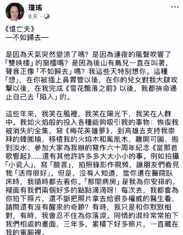在琼瑶逝世前六日,她还发表了一篇亡夫回忆录——《忆亡夫》。