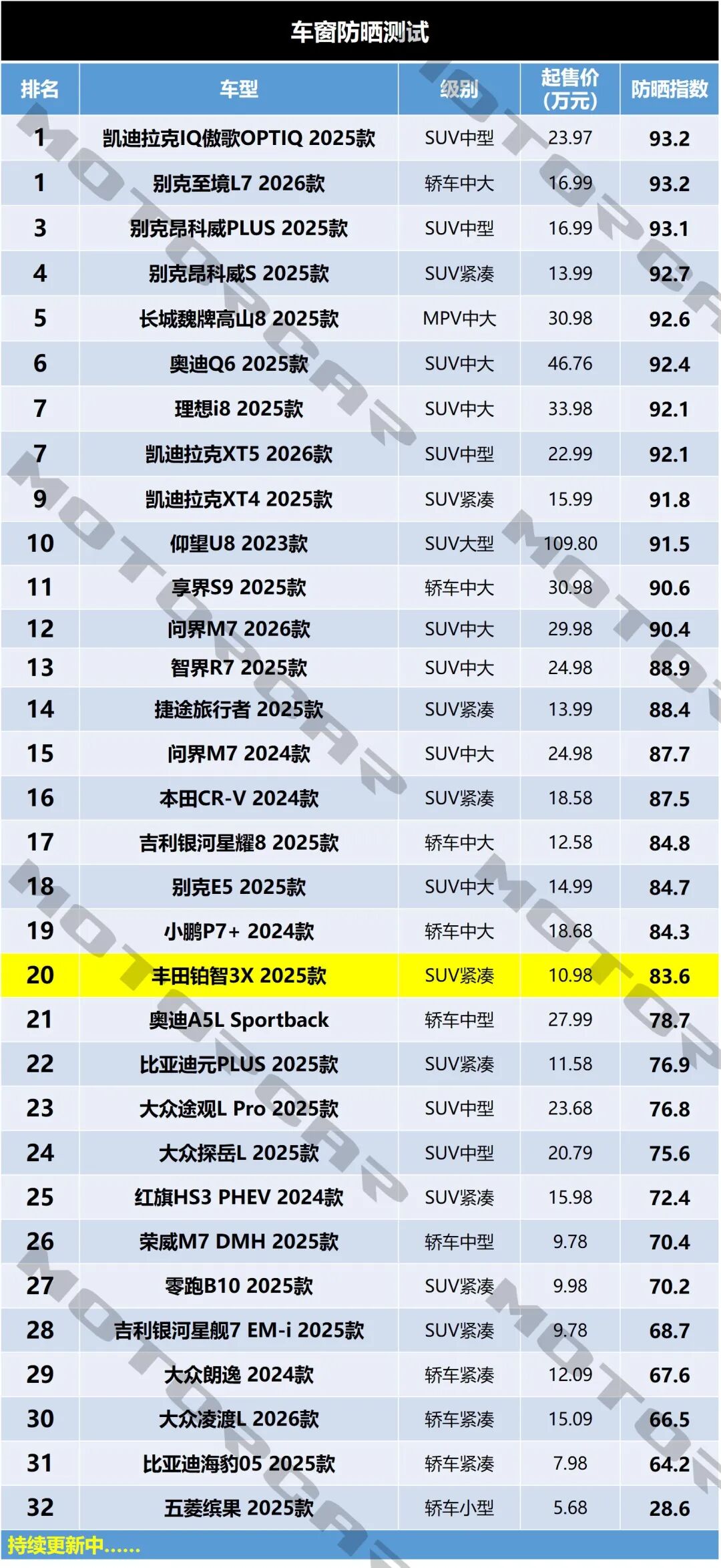 按照测试模型计算下来,丰田铂智3X 2025款全车防晒指数为83.6分,在目前的测试排名中暂时排名第20。虽说前排侧窗玻璃用料较差,但是通过横向对比就能发现,这样的得分其实也算是对得起价格了。